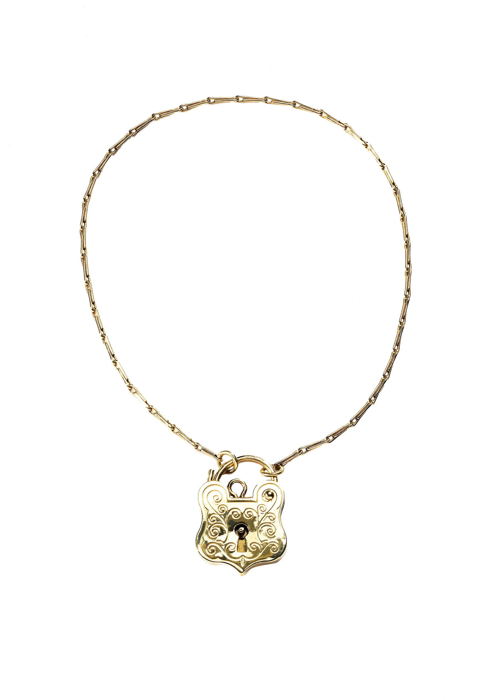 A 9ct gold bracelet with a vintage padlock. The vintage padlock is shield shaped for protection with its original engraving and new 9ct gold chain.